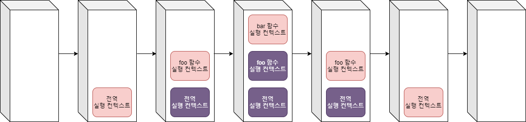 bar 함수가 종료되면 코드의 제어권은 다시 foo 함수로 이동한다. 이때 자바스크립트 엔진은 bar 함수 실행 컨텍스트를 실행 컨텍스트 스택에서 팝하여 제거한다. 그리고 foo 함수는 더 이상 실행할 코드가 없으므로 종료된다.