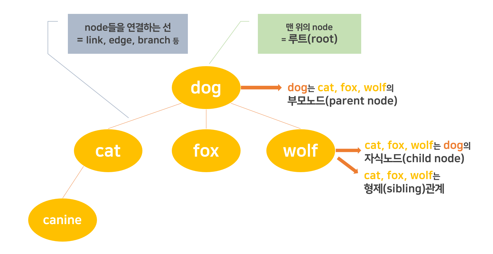 dog는 cat, fox, wolf의 부모 노드(parent node)이고, cat, fox, wolf는 dog의 자식노드(child node)이다.