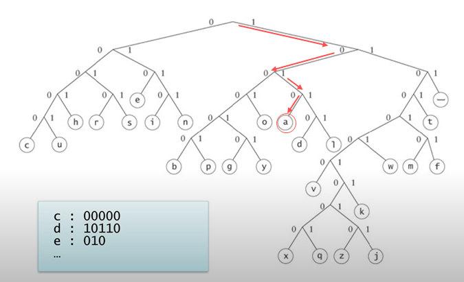 Huffman code에서는 각각 알파벳에 부여된 이진 코드들을 위 그림과 같이 하나의 트리의 형태로 표현할 수 있다.
