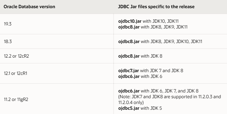 The Oracle JDBC driver is always compliant to the latest JDK version in each of the new releases. In some versions, JDBC drivers support multiple JDK versions. Use the table below to choose the correct JDBC driver based on your preferred JDK version.